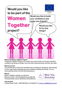 The Women Together Project is an exciting new Wai Yin Society project starting in January 2020. The project is for BME women who are economically inactive and it aims to build their confidence, skills and work readiness by involving them in activities which boost their sense of wellbeing and self-esteem.